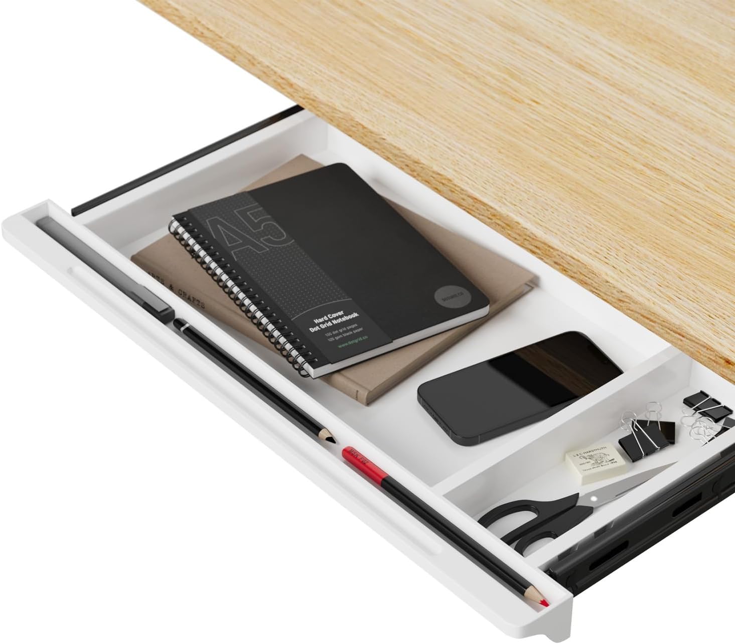 小编推荐:这款桌下抽屉采用抽拉式滑动托盘设计,可有效利用办公桌下方空间,帮助整理收纳物品。白色外观简洁,安装后能保持桌面整洁,提升工作区域的组织性。