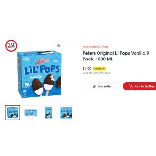 - Coles 现有 Peters Original 香草味雪糕 9个装,现价$4.00(指导价$8.00)。